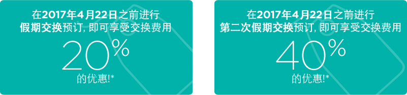 对于精选假期预订,优惠只适用于指定RCI度假村出行时间2017年5月到10月之间。