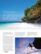 rainforests. Rare bird species, including the majestic Frigatebird, call Tioman home. And its azure waters are filled with beautiful corals of all shapes and colours and a diversity of sea creatures.